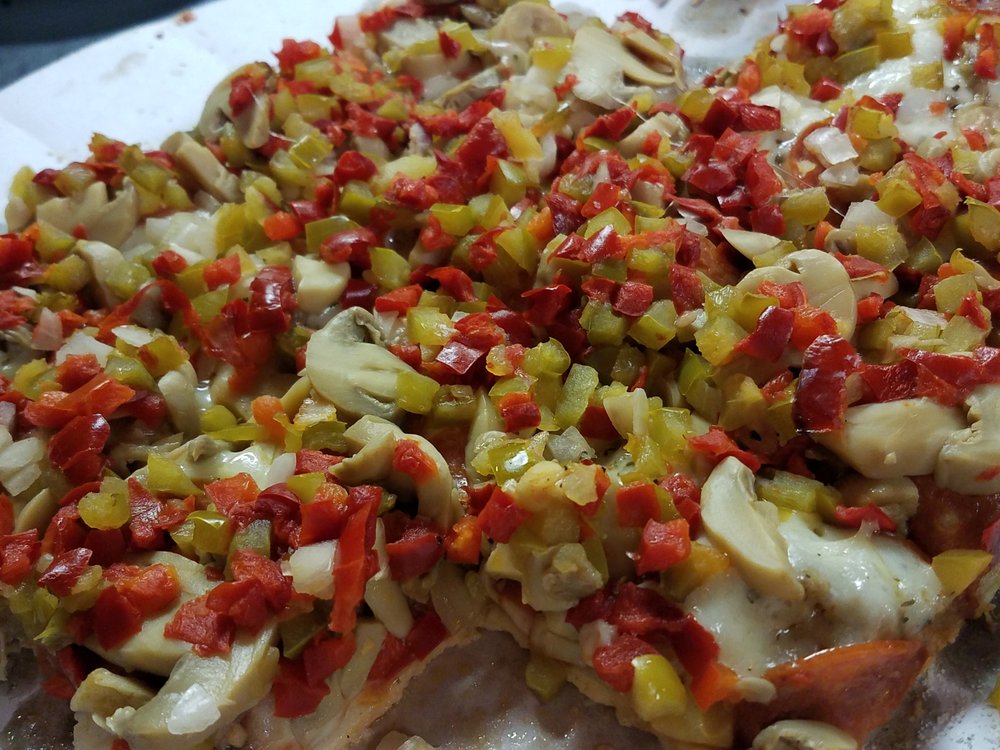 Mushrooms, onion, banana peppers, red and green pepper, black and green olives.